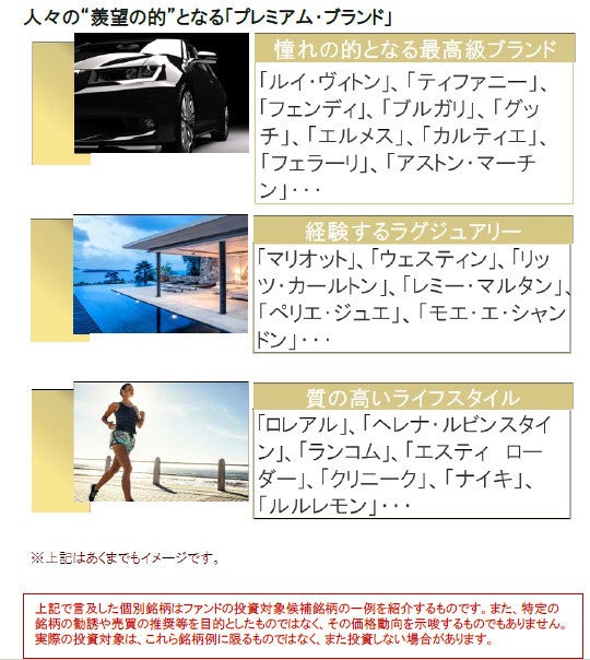 また、「人とは違う」または「より良い」モノやサービスを手にしたい、といった人々の欲求はいつの時代でも変わらないものです。人々の「羨望の的」となるようなプレミアム・ブランド商品やサービスは、そうした要求を満たすものであると考えられます。