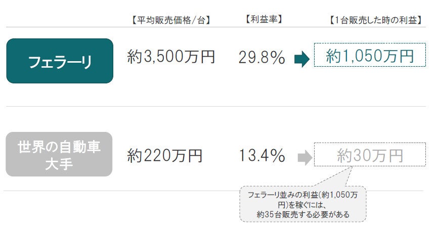 フェラーリが自動車を1台(約3,500万円)販売して得られる利益は、過去5年間の平均利益率(ここではEBITDA(税引き前利払い前償却前)利益率)約29.7%から計算すると、約1,050万円となります。業界大手企業がこれと同じ程度の利益を稼ぎだすためには、約35台販売しなくてはなりません。このことは、フェラーリがいかに効率よく利益を生み出せるか(=高い収益性)を示しています。
