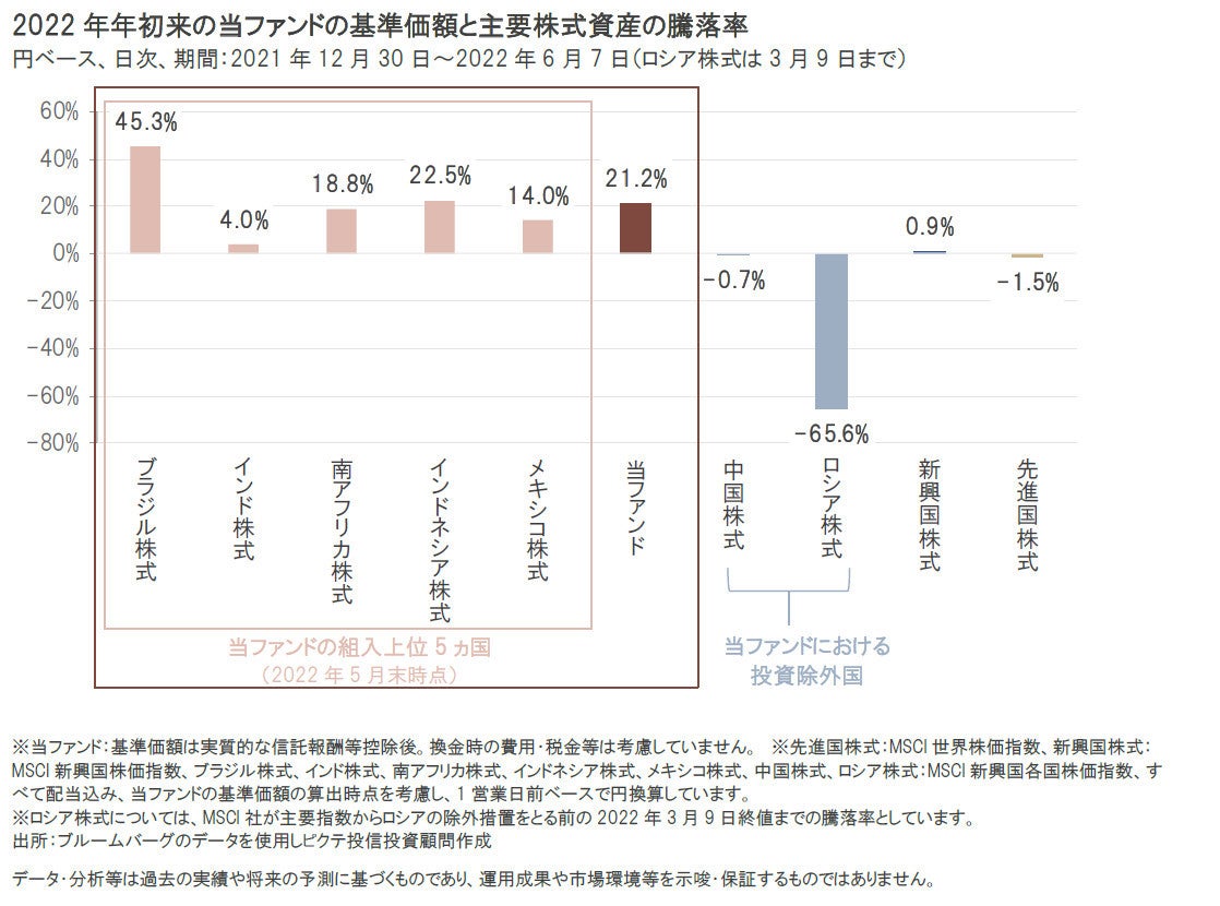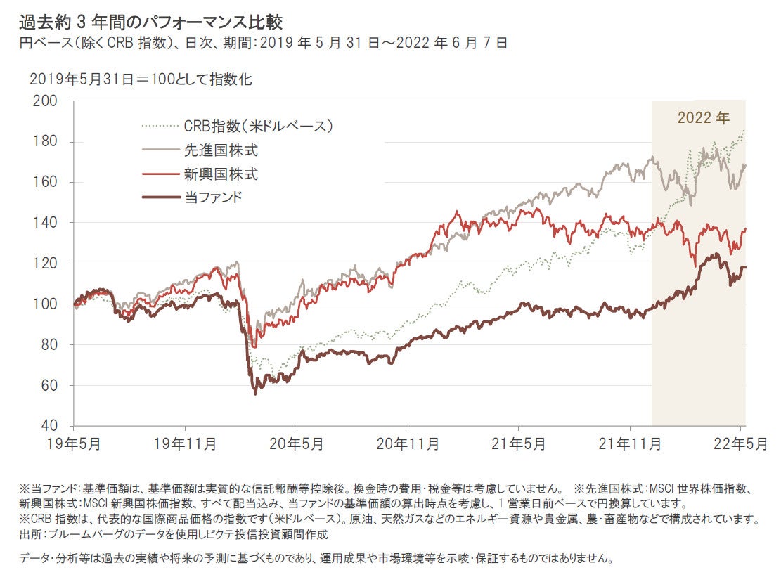 世界の株式市場は2022年年初以来、世界的なインフレ圧力の高まりや米国のより積極的な金融引き締め姿勢、ウクライナ情勢の長期化、ゼロコロナ政策による中国の経済停滞など、様々な懸念に直面し、値動きが不安定となっています。こうした市場の流れにもかかわらず、当ファンドの基準価額は、2022年年初来(6月7日まで)で+21.2%の上昇となっています。