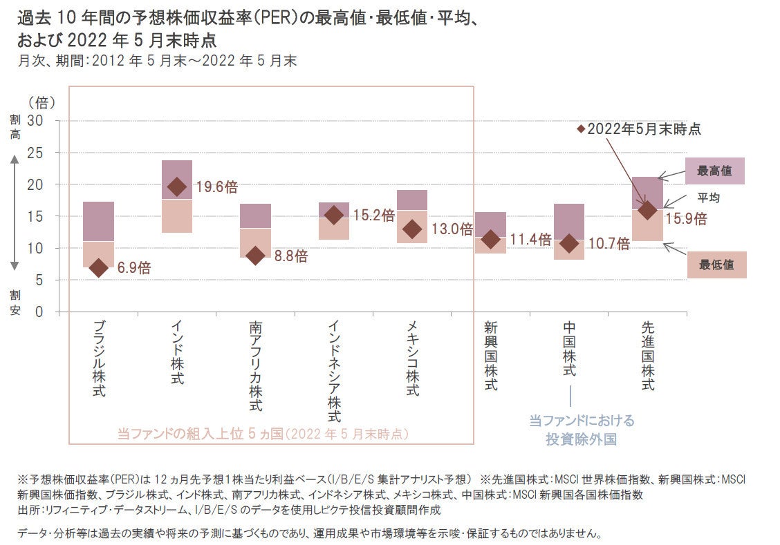 当ファンドは、新興国の中でも、労働人口増加国の企業の株式へ投資を行っています。2022年5月末時点の組入上位国の株式のバリュエーション(投資価値評価)水準をみると、先進国に比べて割安感のある新興国株式市場のなかでも相対的に割安感がある国が散見されます。たとえば、ブラジル株式の予想株価収益率(PER)は、相対的な割安感があり、また、過去10年間でみても割安水準にあります。米国を中心にインフレ圧力の高まりや主要中央銀行が金融引き締めに動いていることなどを受けて長期金利が上昇し、株式市場では高バリュエーション銘柄が売られやすい環境にありますが、その一方でバリュエーション水準に割安感のあるブラジル株式などは、投資家の注目を集める格好となっています。