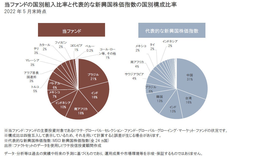 また、2022年5月末時点の組入上位国は、東欧諸国などに比べると、地理的にみてウクライナ情勢の直接的な影響を受けにくいとみられます。さらに、当ファンドは前述の通り、労働人口増加国に投資を限定しているため、中国株式を投資対象から除外しています。中国経済の先行きについては、ゼロコロナ政策の経済に与えるマイナスの影響に加えて、当局の産業規制動向や米中関係など様々な懸念材料があります。中国は世界第2位の経済大国であり、その動向の影響は広く波及するため、当ファンドの投資国も無関係ではいられませんが、懸念材料が多く株価が低迷している中国株式に直接的に投資を行っていないことも、当ファンドの年初来の基準価額にはプラス要因となりました。