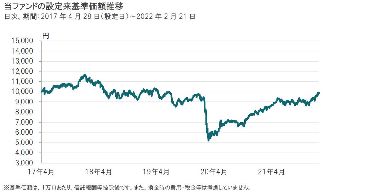 足元の株式市場を取り巻く投資環境は、米国をはじめとした主要国の金融政策引き締め加速観測や、ウクライナ情勢の緊迫化など不安定要素が多くあります。2022年年初来の世界の株式市場は、これまで好調なパフォーマンスを示してきた成長株を中心に大きく下落となっています。一方、当ファンドのパフォーマンスは、2022年年初来、相対的に堅調なパフォーマンスを示しています。