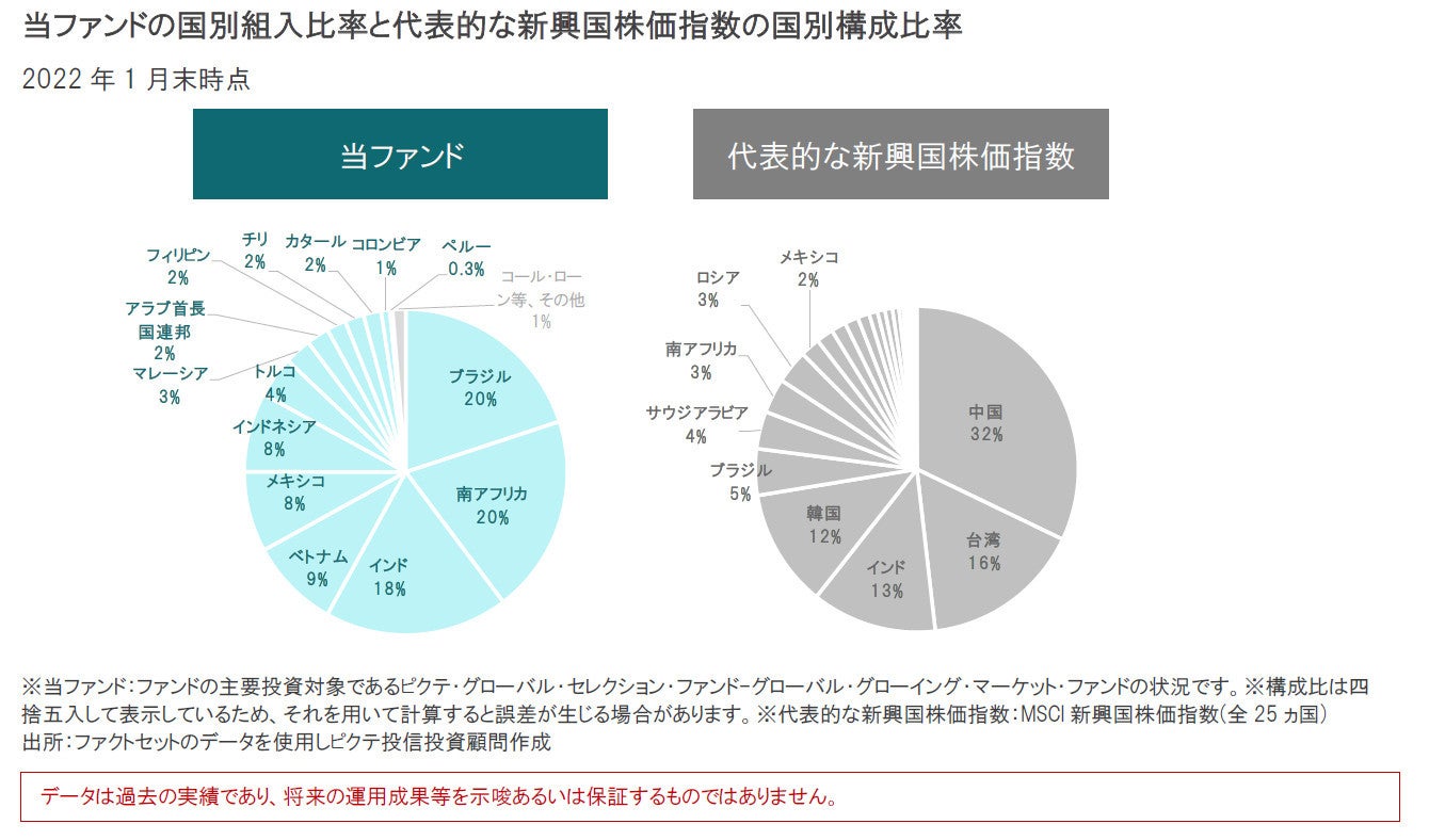 足元で当ファンドのパフォーマンスが相対的に堅調に推移している背景の1つには、ロシア株式の組入れがないことや、当局による産業規制強化、景気減速懸念、米中関係悪化などの懸念材料が多い中国株式の組入れがないことがあります。加えて、バリュエーション(投資価値評価)水準に相対的に割安感があり、今年に入って復調がみられるブラジル株式の組入れや、新型コロナウイルスの感染拡大後の経済再開で景気回復期待の高まるインド株式、世界的な資源価格高騰の恩恵を受けるとみられる資源国(例:ブラジル、南アフリカなど)の組入れなどがプラス寄与となっています。