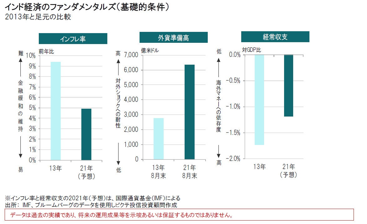 米国では景気回復などを背景に量的金融緩和の縮小の議論が始められています。2013年に米連邦準備制度理事会(FRB)が量的金融緩和の縮小を示唆した際には、世界の金融市場は大きく動揺し、特に新興国市場から資金を引き揚げる動きが強まりました。今後、近い将来に米国をはじめ世界的に金融政策の正常化が進む中で、インド株式をはじめ新興国資産はマイナスの影響を受けることも想定されます。ただし、足元のインド経済のファンダメンタルズ(基礎的条件)は、2013年当時と比べて改善していることは安心材料の1つとなるでしょう。