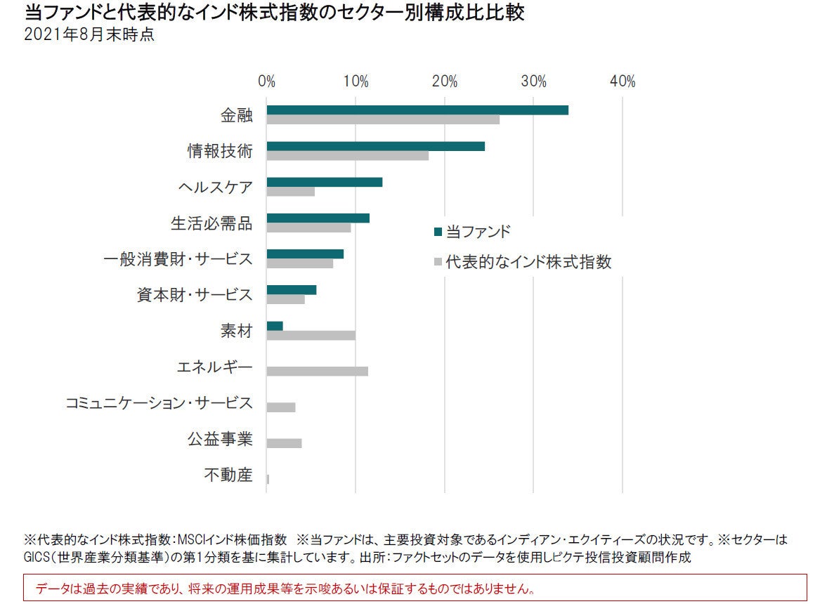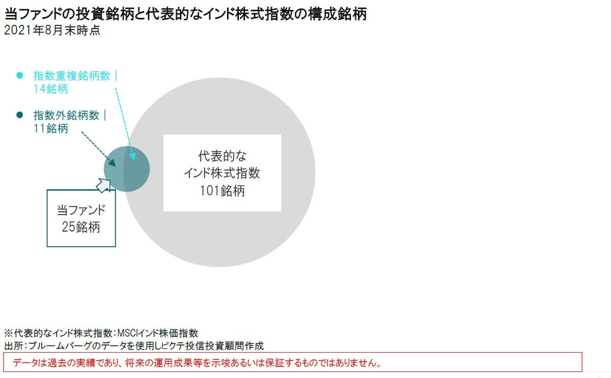 当ファンドでは、2021年8月末時点の投資銘柄は25銘柄と、厳選投資を行っています。この投資銘柄のうち、代表的なインド株式指数(ここではMSCIインド株価指数)の構成銘柄と重複するのは14銘柄であり、残りの11銘柄は同指数には含まれていません。