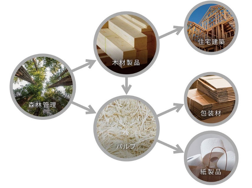 森林から切り出された木材は、住宅などの建設に使われる角材や木材パネルなどの木材製品や、紙、段ボールなどの製造に使われるパルプとして加工されます。また木材パルプを使った繊維、織物を製造する企業も環境意識が高まる中、注目されています。