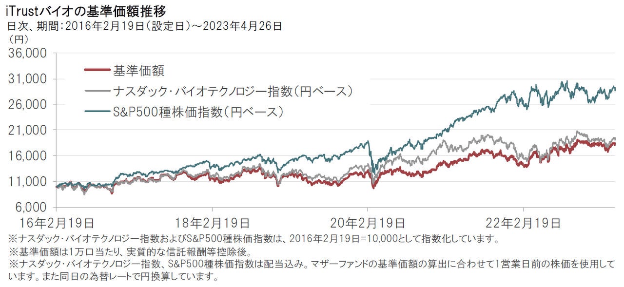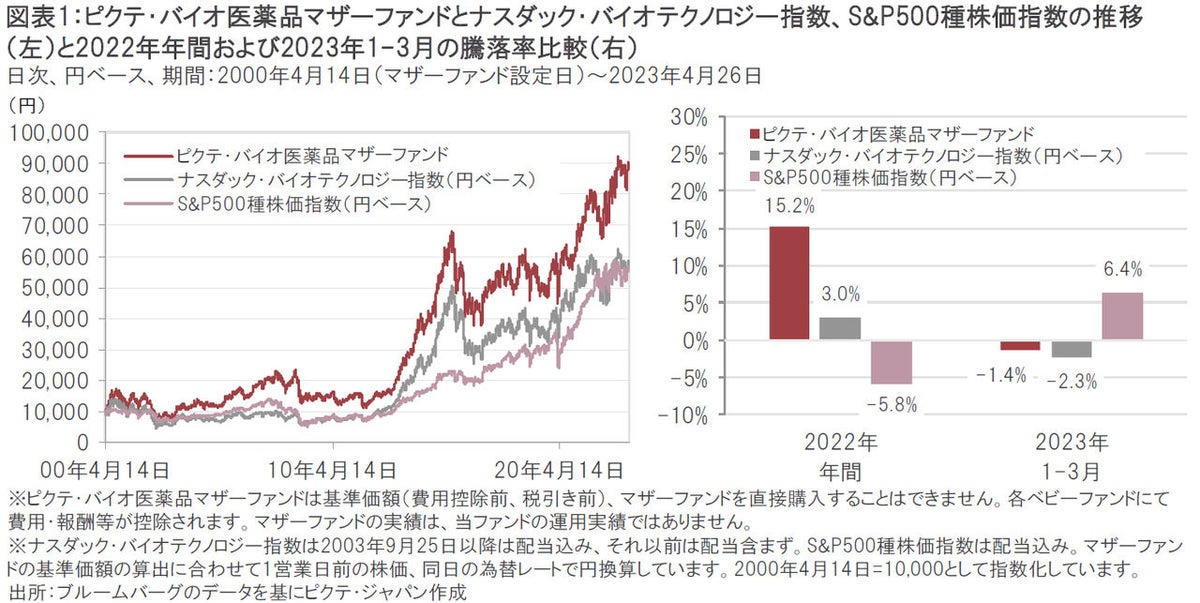ピクテ・バイオ医薬品マザーファンドは、2023年1-3月に-1.4%の下落となりましたが、バイオ医薬品株式の代表的な指数であるナスダック・バイオテクノロジー指数(円ベース)の同-2.3%は上回りました(図表1参照)。