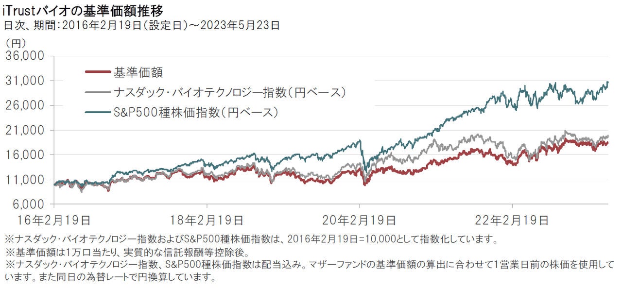 しかし2023年に入ると、株式市場では、情報技術やコミュニケーション・サービス、一般消費財・サービスなどの業種が大きく上昇した一方、ヘルスケアや公益事業、生活必需品などディフェンシブ性が相対的に高い業種は市場平均を下回るパフォーマンスとなり、バイオ医薬品株式についても米国株式を下回るパフォーマンスとなりました。