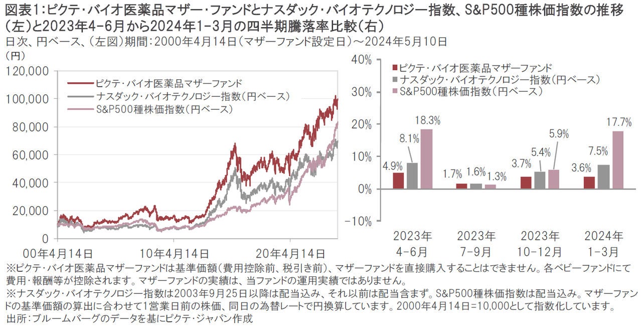 ピクテ・バイオ医薬品マザーファンドは、円安・米ドル高などが寄与し2024年1-3月に+3.6%の上昇となりました。一方、バイオ医薬品株式の代表的な指数であるナスダック・バイオテクノロジー指数(円ベース)の+7.5%を下回りました。(図表1参照)。