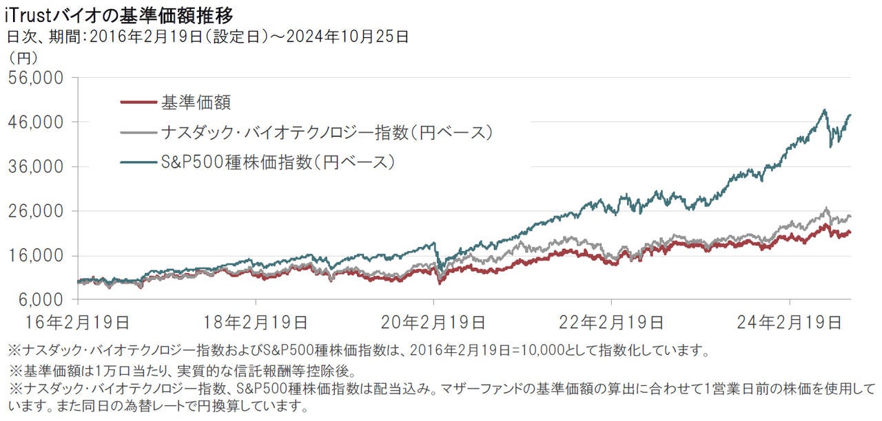 バイオ医薬品株式は、金利感応度が相対的に高い一面があります。米国では9月に大幅な利下げが実施されましたが、各種経済指標で米国景気の底堅さが確認されていることもあり、今後、利下げ幅がどの程度になるのかは不透明な状況で、金利がどのように変動するかについては注意が必要と考えます。また、薬価引き下げの動きや米国大統領選挙の動向、治験結果の発表、決算の内容などが株価動向に影響を与える可能性などに注視が必要と考えます。