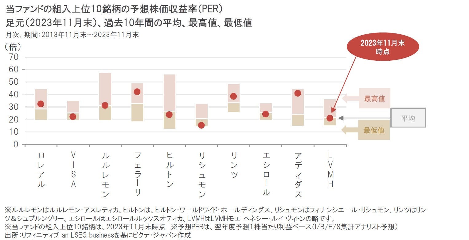 また、足元のプレミアム・ブランド企業の株式のバリュエーション(投資評価価値)水準をみると、過去10年間の平均を下回る企業も散見されます。今後、インフレが落ち着き、欧米などの金融当局による金融引き締め姿勢が後退し、利下げへと転換した場合には、消費者心理は大きく改善し、プレミアム・ブランド商品・サービス需要拡大が後押しされると考えられます。こうしたシナリオと魅力的な足元のバリュエーション水準を考慮すると、プレミアム・ブランド企業への良好な投資機会になる可能性もあると考えています。
