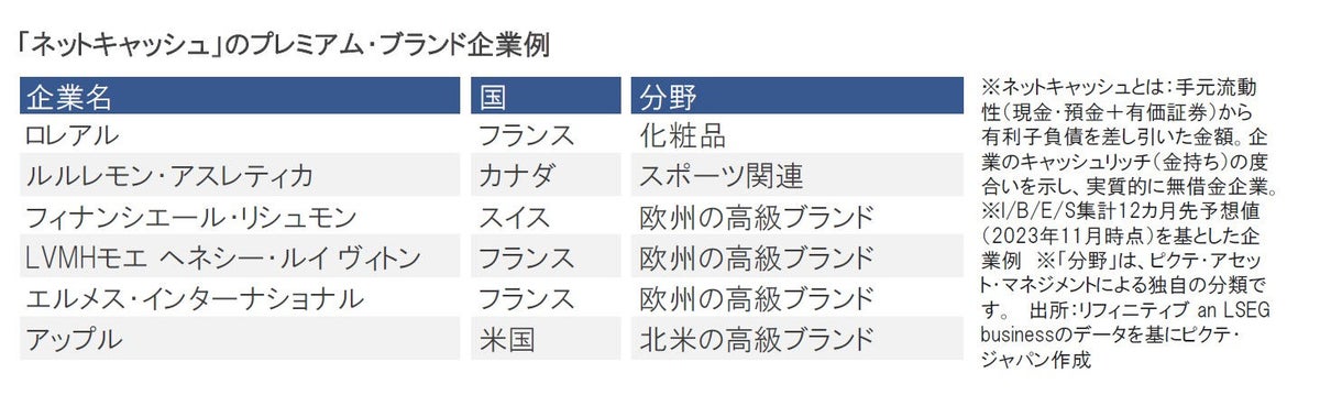 多くの企業が、金利上昇による債務コストの増加や、景気減速による需要減退という難局に直面する可能性が高い一方、プレミアム・ブランド企業の多くは、健全な財務基盤を有し、さらに、消費者を惹きつけてやまない魅力ある商品・サービスを提供していることなどから、継続してキャッシュ・フローを創出することができると予想されるため、相対的に優位性を持っていると考えられます。