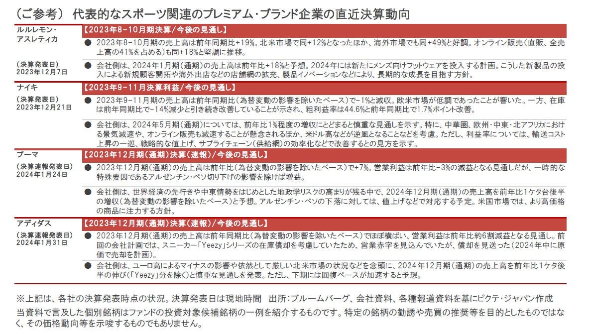 スポーツ関連のプレミアム・ブランド企業のうち、ナイキ(米国)、アディダス(ドイツ)、プーマ(ドイツ)などが発表した直近四半期決算では、業績の回復は依然として途上であることが示されました。また、今後の見通しについても、多くの企業が世界の景気減速などを考慮し慎重な見方を発表しています。