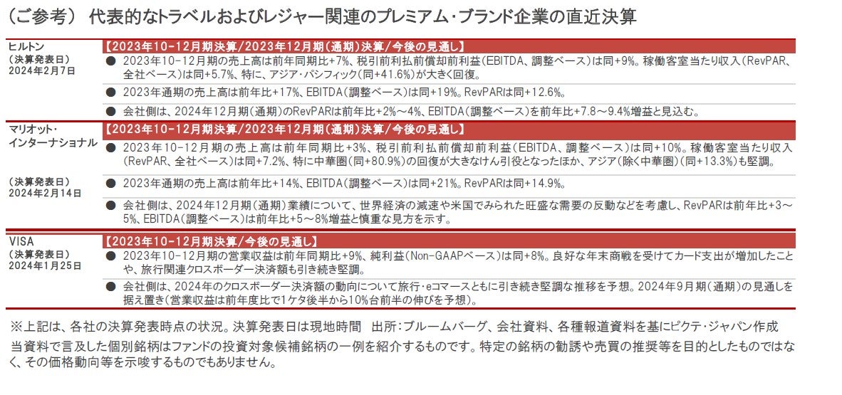 トラベルおよびレジャー関連企業からは、依然として旺盛なトラベル・レジャー需要があることが示されました。トラベル関連の代表格であるホテル運営企業からは、中国をはじめとしたアジアの需要が大きく回復していることが示されました。一方、2024年以降は、コロナ・ショック以降これまでの数年間にみられた急回復局面から、正常化に向かう中で増収・増益率はこれまでに比べると緩やかなものになるとの見方が強まっています。