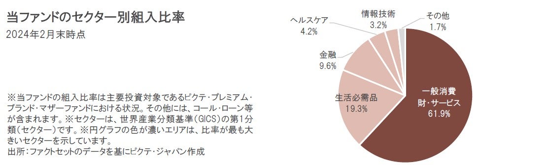 プレミアム・ブランド企業は前述の通り、「消費関連」銘柄です。当ファンドの組入銘柄をセクター別にみると、一般消費財・サービスに属する銘柄が最も多く、次いで生活必需品となっています。