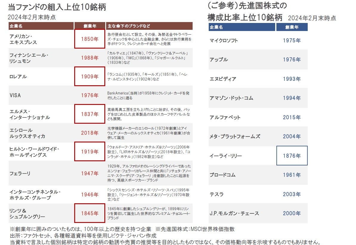 当ファンドの2024年2月末時点の組入上位10銘柄の顔ぶれをみると、長い歴史を有する企業あるいは傘下のブランドが多く存在しています。