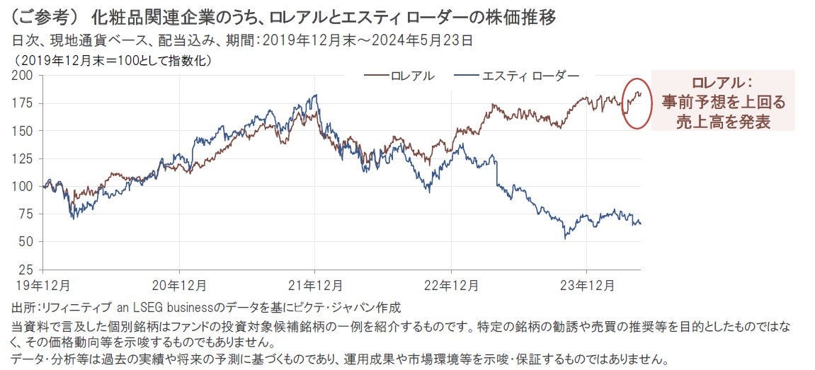 化粧品関連のプレミアム・ブランド企業は、引き続き中国本土市場の回復の遅れやトラベル・リテール関連の低迷といった厳しい環境に直面しています。ただし、これらも緩やかながら回復基調にある模様です。こうした市場環境下、ロレアル(フランス)が発表した2024年1-3月期売上高は、事前予想を上回り、同社のブランド力やオペレーション力が優れていることを改めて示す形となりました。このため、株価も2024年1-3月期売上高の発表後、急反発しました。
