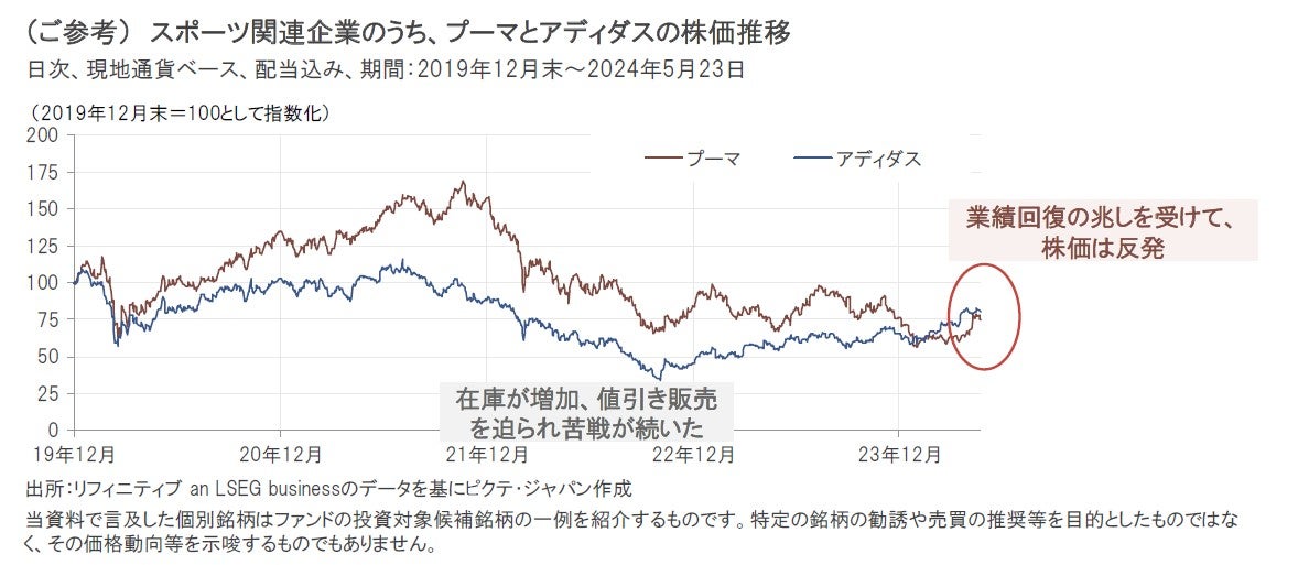 スポーツ関連のプレミアム・ブランド企業のうち、アディダス(ドイツ)とプーマ(ドイツ)は、業績改善の兆しを示す2024年1-3月期決算を発表しました。アディダスの展開する「サンバ」を筆頭としたテラスシューズ(欧州らしいクラシックな薄底スニーカー)は、競合のナイキ(米国)が展開するバスケットボールシューズのような厚底スニーカーから人気を奪っているとみられています。特に、Z世代にテラスシューズは人気があります。こうしたことは、消費者は新しいトレンドや革新的な商品を熱望している、ということの1つの事例であると考えられます。