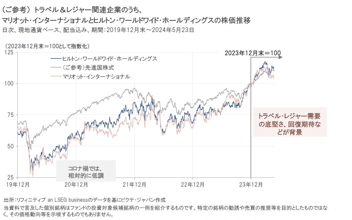 また、2024年年初来の株価動向(現地通貨ベース、配当込み)をみると、特にヒルトン・ワールドワイド・ホールディングス(米国)は、AIブームにけん引されて好調な先進国株式と比較しても、遜色のないパフォーマンスとなっています(2024年5月23日時点)。