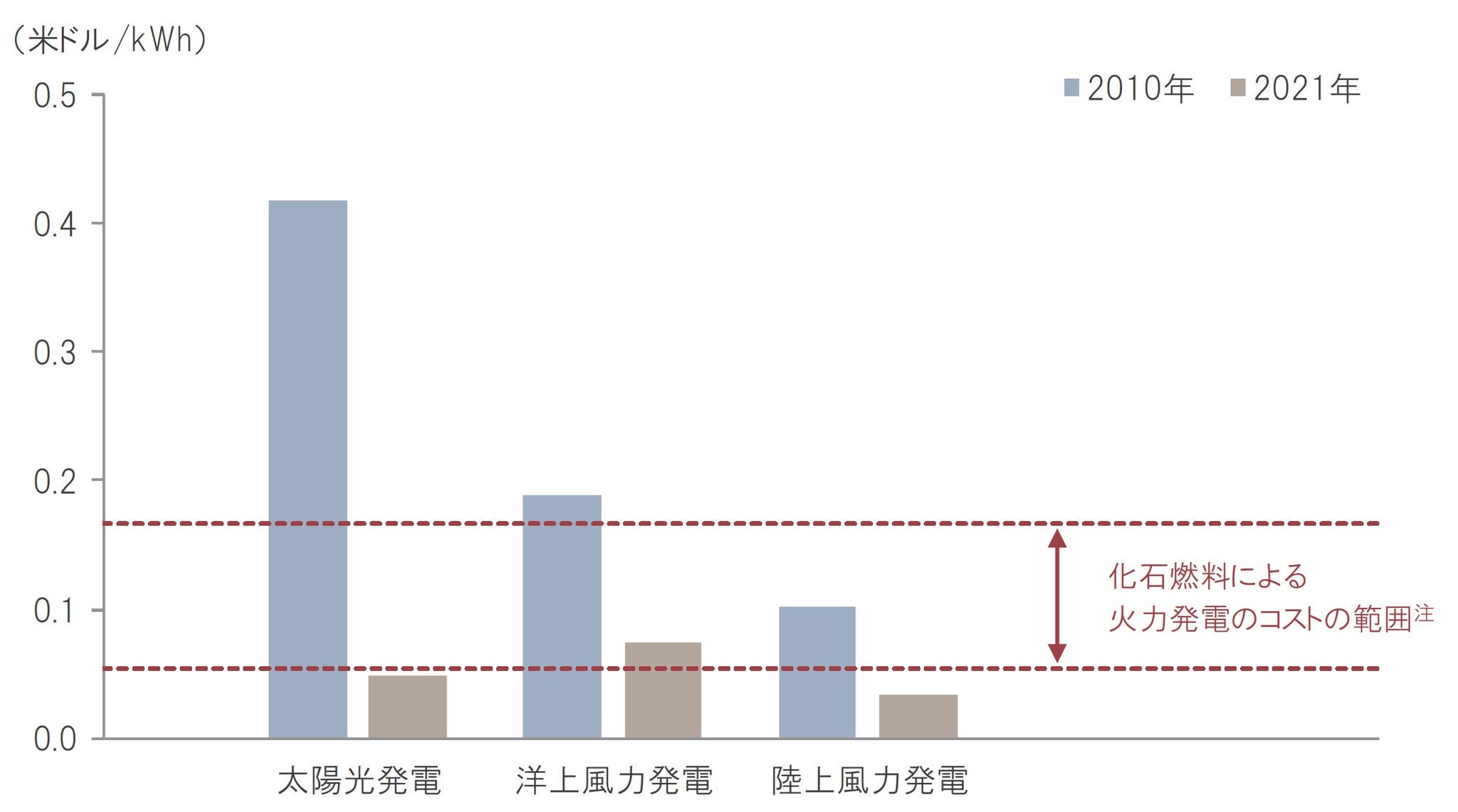 注:国際再生エネルギー機関(IRENA)が推定する2021年の化石燃料による火力発電のコスト