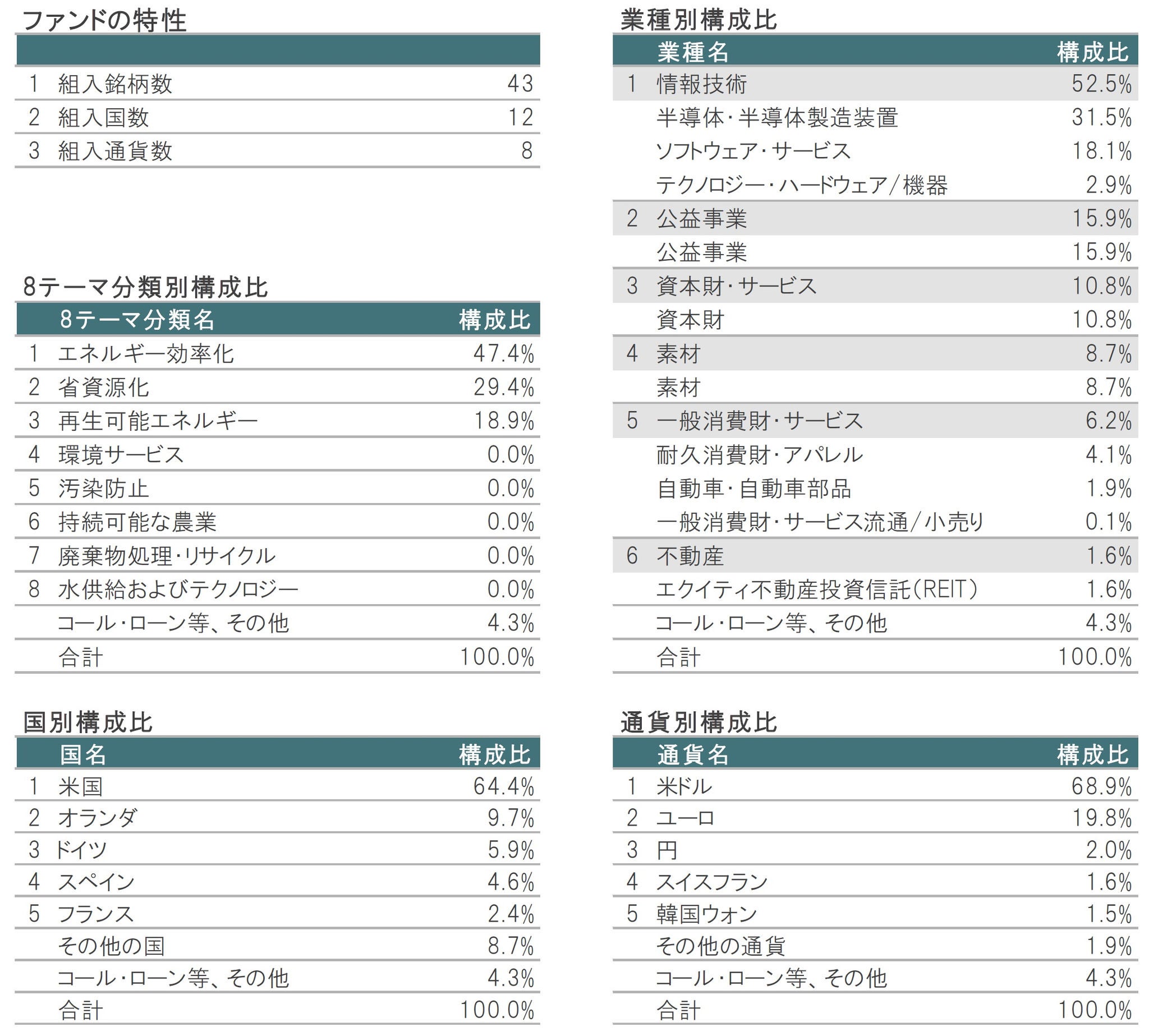 8テーマ分類別構成比については、エネルギー効率化が47.4%、省資源化が29.4%、再生可能エネルギーが18.9%などとなっています。業種別構成比(GICS第1分類)については、情報技術の比率が52.5%と過半を占めていますが、組入業種は多岐にわたります。