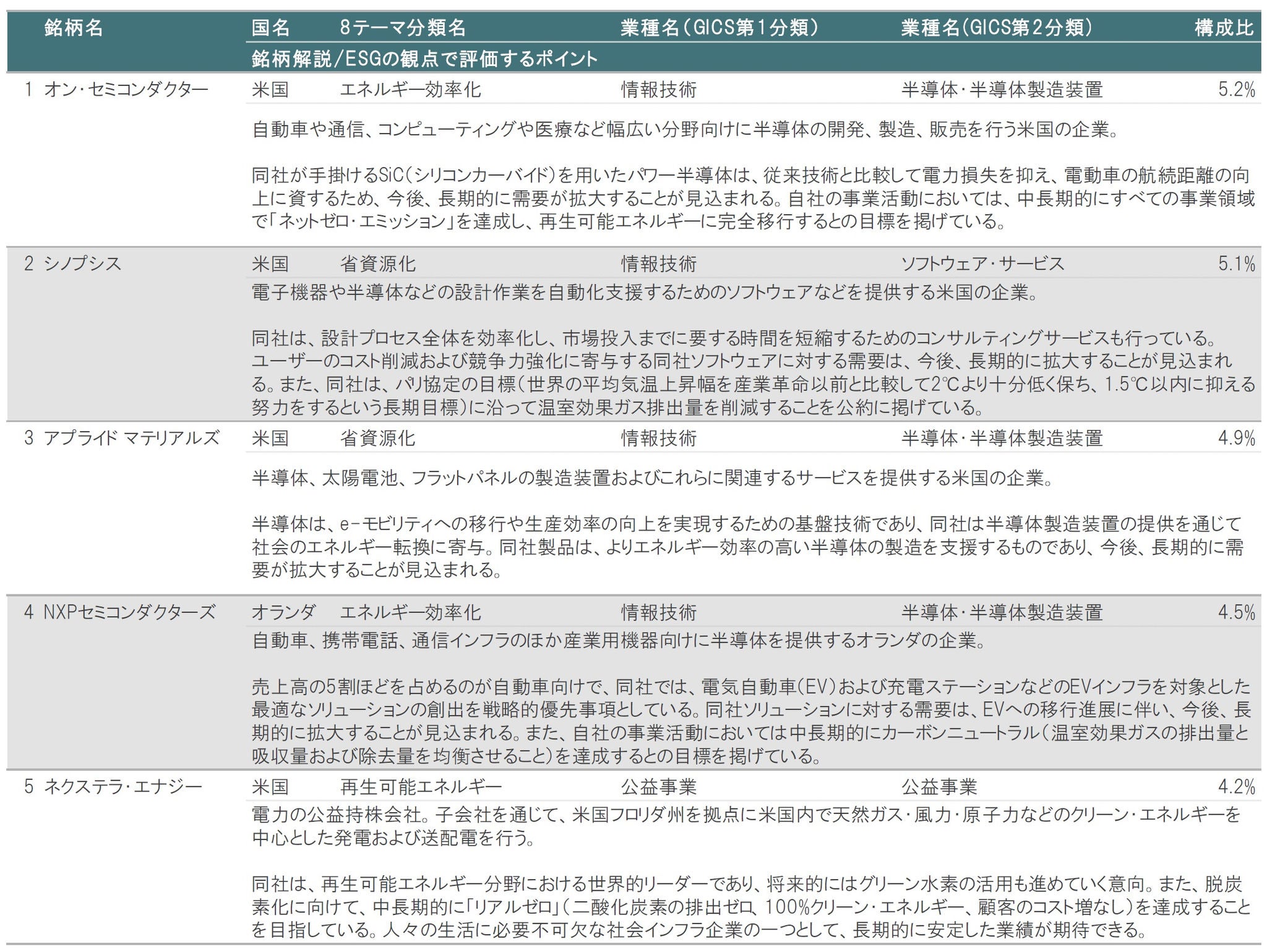 図表3、4に示したとおり、2023年9月末時点の組入上位10銘柄の内訳は、①8テーマ分類別では、エネルギー効率化が7銘柄、省資源化が2銘柄、再生可能エネルギーが1銘柄、②業種別(GICS第1分類)では、情報技術が6銘柄、公益事業が1銘柄、一般消費財・サービスが1銘柄、素材が1銘柄、資本財・サービスが1銘柄などとなっています。
