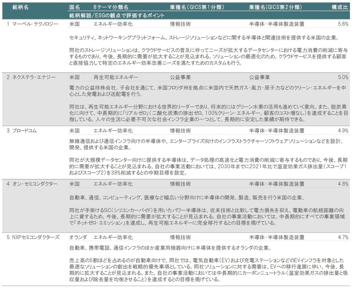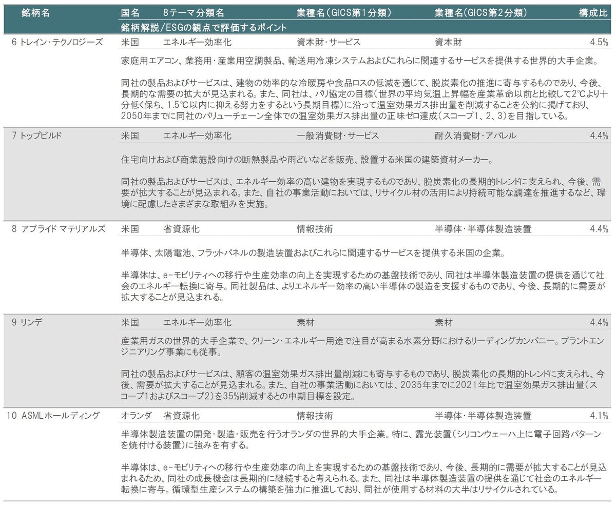 図表3、4に示したとおり、2024年1月末時点の組入上位10銘柄の内訳は、①8テーマ分類別では、エネルギー効率化が7銘柄、省資源化が2銘柄、再生可能エネルギーが1銘柄、②業種別(GICS第1分類)では、情報技術が6銘柄、公益事業が1銘柄、資本財・サービスが1銘柄、一般消費財・サービスが1銘柄、素材が1銘柄、などとなっています。