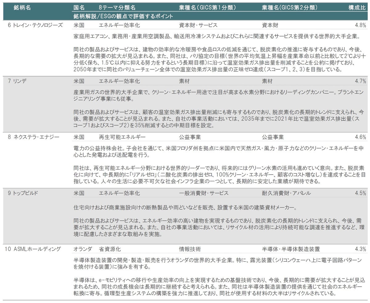 図表3、4に示したとおり、2024年2月末時点の組入上位10銘柄の内訳は、①8テーマ分類別では、エネルギー効率化が7銘柄、省資源化が2銘柄、再生可能エネルギーが1銘柄、②業種別(GICS第1分類)では、情報技術が6銘柄、資本財・サービスが1銘柄、素材が1銘柄、公益事業が1銘柄、一般消費財・サービスが1銘柄、などとなっています。