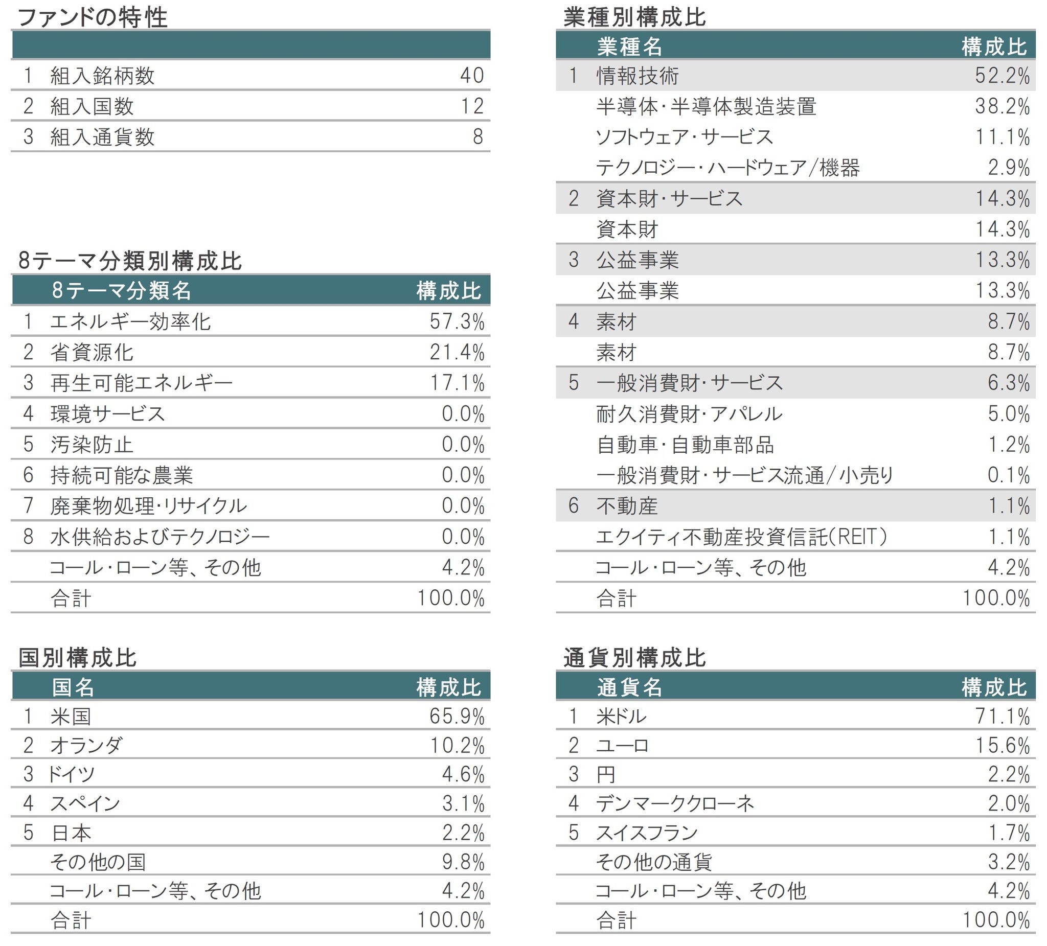 8テーマ分類別構成比については、エネルギー効率化が57.3%、省資源化が21.4%、再生可能エネルギーが17.1%などとなっています。業種別構成比(GICS第1分類)については、情報技術の比率が52.2%と過半を占めていますが、組入業種は多岐にわたります。