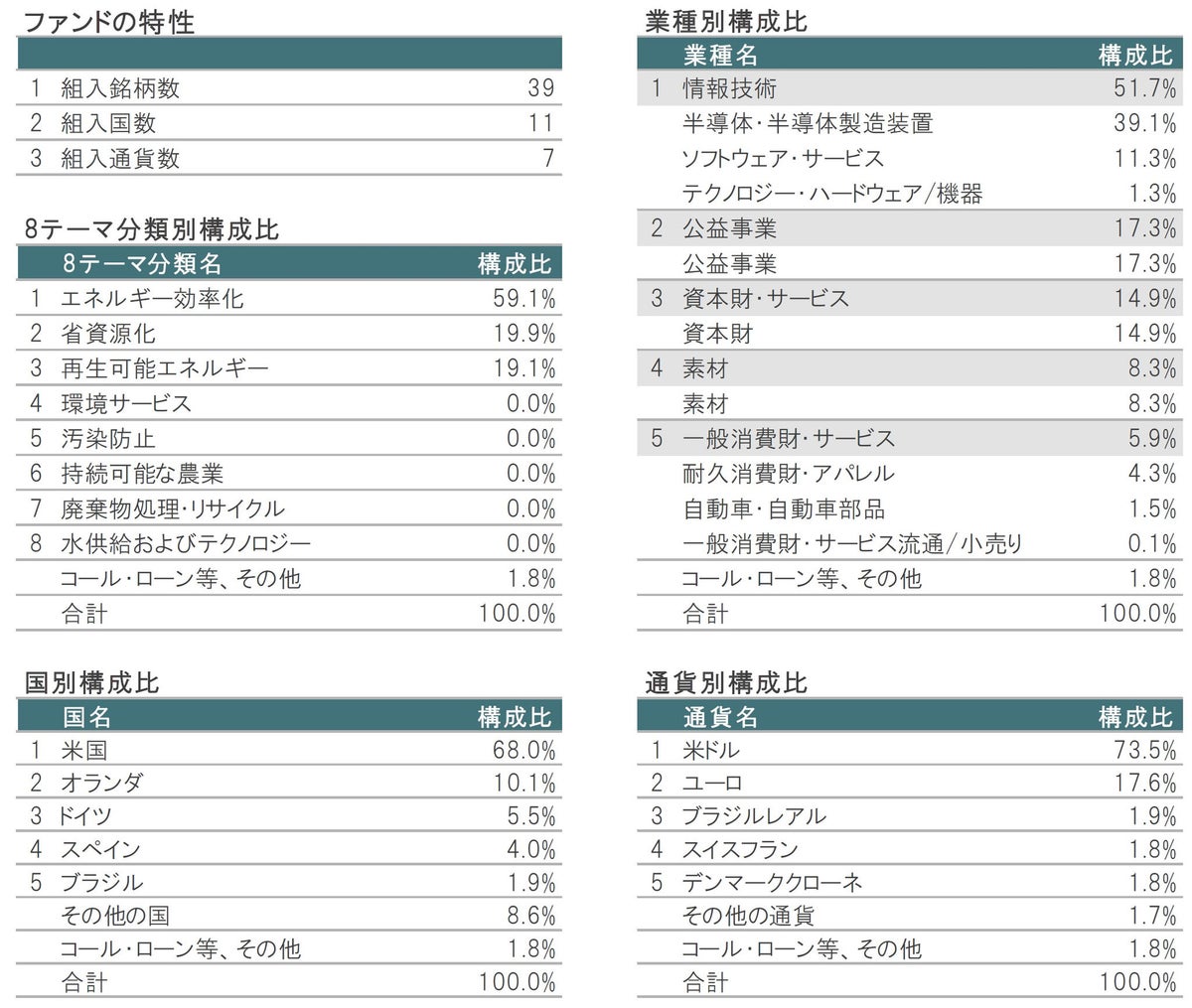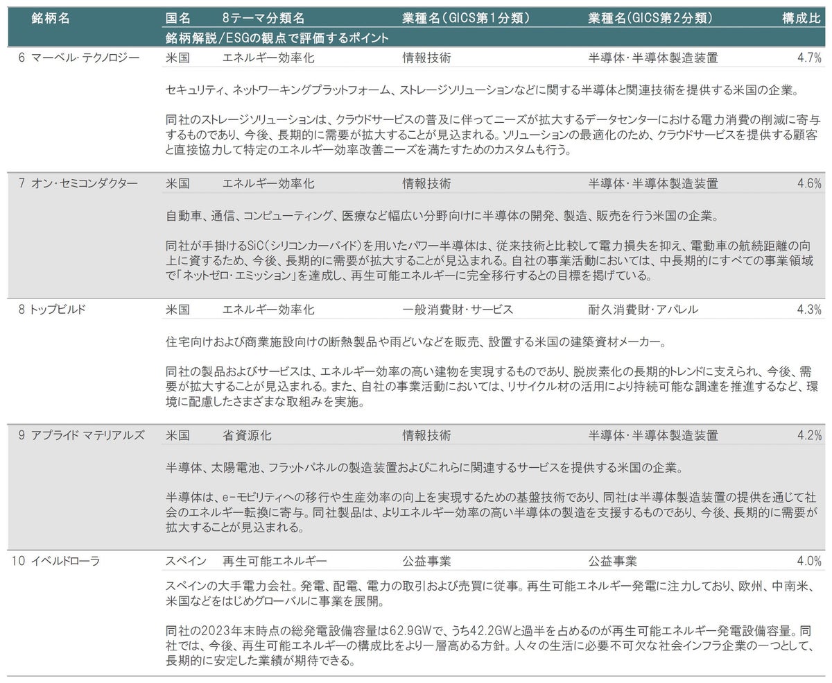 図表3、4に示したとおり、2024年6月末時点の組入上位10銘柄の内訳は、①8テーマ分類別では、エネルギー効率化が7銘柄、再生可能エネルギーが2銘柄、省資源化が1銘柄、②業種別(GICS第1分類)では、情報技術が5銘柄、公益事業が2銘柄、資本財・サービスが1銘柄、素材が1銘柄、一般消費財・サービスが1銘柄、などとなっています。