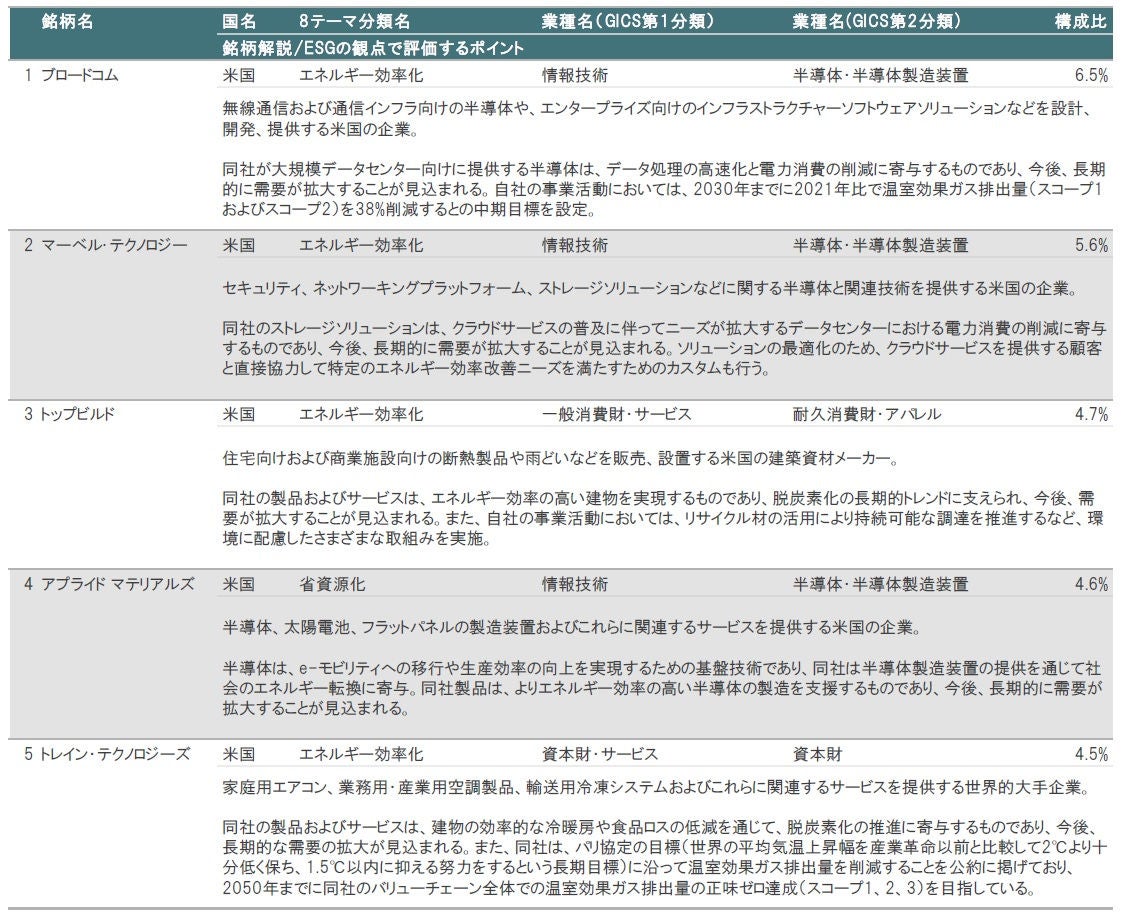 図表3、4に示したとおり、2025年1月末時点の組入上位10銘柄の内訳は、①8テーマ分類別では、エネルギー効率化が8銘柄、省資源化が1銘柄、再生可能エネルギーが1銘柄、②業種別(GICS第1分類)では、情報技術が5銘柄、資本財・サービスが2銘柄、一般消費財・サービスが1銘柄、公益事業が1銘柄、素材が1銘柄となっています。