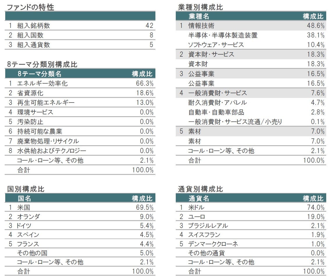 8テーマ分類別構成比については、エネルギー効率化が66.3%、省資源化が18.6%、再生可能エネルギーが13.0%となっています。業種別構成比(GICS第1分類)については、情報技術の比率が48.6%と全体の半分近くを占めていますが、組入業種は多岐にわたります。