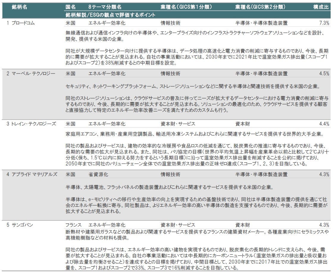 図表3、4に示したとおり、2025年6月末時点の組入上位10銘柄の内訳は、①8テーマ分類別では、エネルギー効率化が8銘柄、省資源化が1銘柄、再生可能エネルギーが1銘柄、②業種別(GICS第1分類)では、情報技術が4銘柄、資本財・サービスが3銘柄、素材が1銘柄、一般消費財・サービスが1銘柄、公益事業が1銘柄となっています。2025年5月末時点と比較して、2025年6月末時点の組入上位10銘柄の顔ぶれに変化はありませんでした。