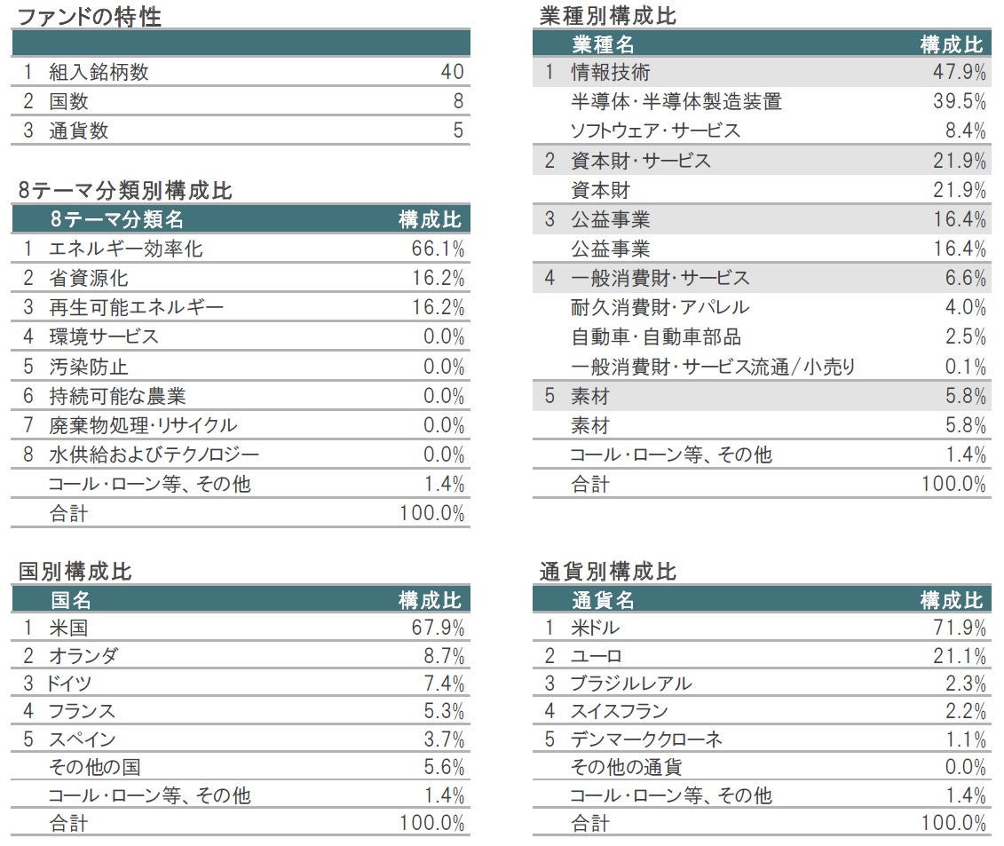 8テーマ分類別構成比については、エネルギー効率化が66.1%、省資源化が16.2%、再生可能エネルギーが16.2%となっています。業種別構成比(GICS第1分類)については、情報技術の比率が47.9%と大きな部分を占めていますが、組入業種は多岐にわたります。
