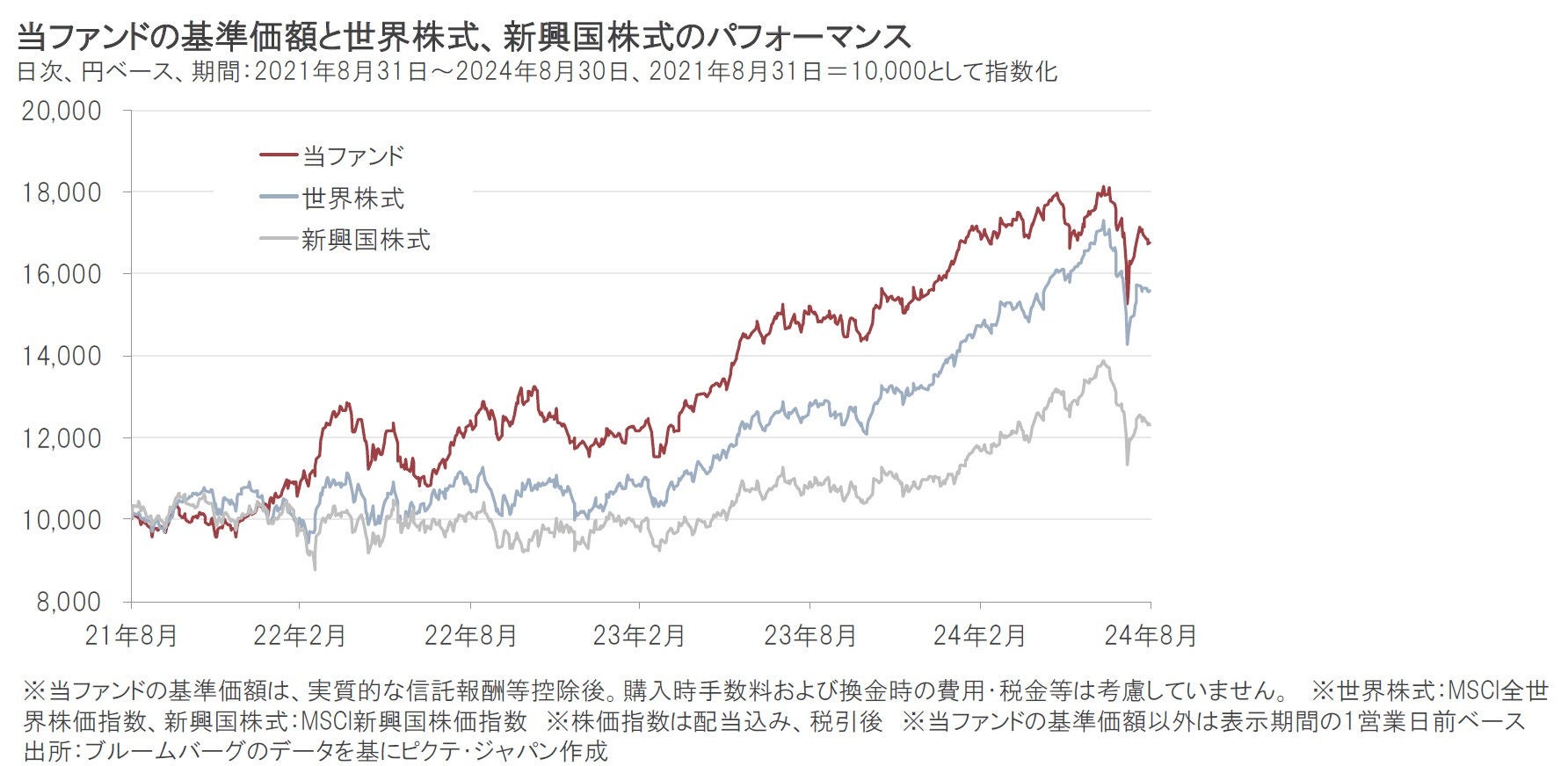 新興国の労働人口増加国の株式に投資する当ファンドの過去3年間の実績では、投資対象株式の相対的に高い利益成長率などを背景に世界株式や新興国株式をアウトパフォームしてきました。足元では、世界の株式市場は、弱い米経済指標の発表を受けて景気減速懸念が高まり、8月に入り急落、その後、米国の景気後退懸念が一旦落ち着いたことやインフレ指標の鈍化を受けて米国やユーロ圏で利下げが示唆されたことなどを背景に、反発しています。為替は日銀の追加利上げを受けて、円高が進行しました。こうしたなか、当ファンドの基準価額も値動きが大きくなっています。