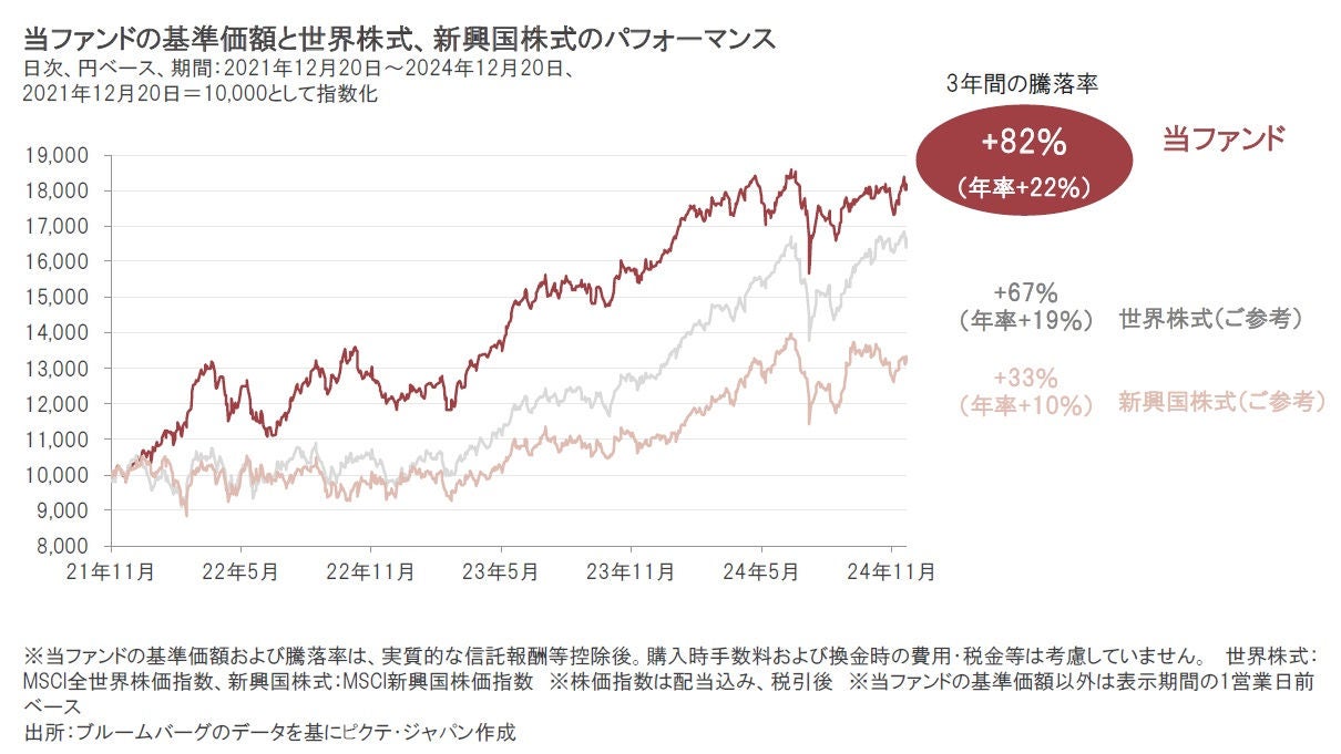 過去3年間の実績では、当ファンドのパフォーマンスは、世界株式や新興国株式平均を上回って推移しました。