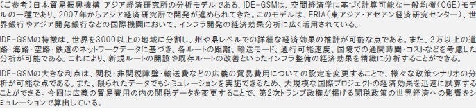 下図は、日本貿易振興機構 アジア経済研究所(IDE-JETRO) が、公約発表時点で第2次トランプ政権が掲げる関税引き上げが各国・地域のGDPに及ぼす影響を分析したものです。米国の関税が、2025年に中国に対して60%に、その他すべての国に対して20%に引き上げられたと仮定し、ベースライン・シナリオと関税引き上げシナリオについて、2年後の2027年時点で比較し、各国・地域のGDPの差分を関税引き上げの影響としています。分析結果は、米国の関税の引き上げは、標的となった国のみならず、米国もマイナスの影響を被ることになる一方、それ以外の一部の国や地域では「漁夫の利」を得ることを示しています。