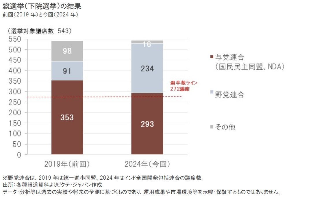 総選挙の結果は予想外の結果となったため、市場関係者は大きく動揺しました。事前予想では、与党インド人民党(BJP)が単独過半数を獲得するとみられたものの、実際はBJPが大きく議席数を減らし、単独過半数割れとなったのです。