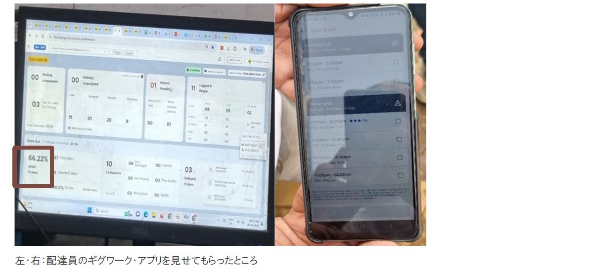 フードデリバリー大手ゾマトの子会社であるブリンキット(食料品や日用品の短時間配達を行う)の配達拠点の1つを訪問しました。彼らは、注文を受けてから極めて短時間(およそ20分以内)のうちに、食料品などの商品を配達する方法(それも利益を確保しながら)を編み出した世界初の企業であるとみています。消費者が、モバイルアプリを通じて商品を注文をし、ギグワーカー(インターネットを介して仕事を請け負う労働者)が10分以内に注文された商品を受け取り、次の10分で自転車で配達します。配達拠点となる倉庫は暗い路地にあり(賃料の安さが重視されている)、そこで配達員に彼らがどのように仕事をこなしているかを実際に教えてもらう機会がありました。同時に、彼らのギグワークを仲介するアプリをみせてもらいました。みせてもらった例では、その日の注文の約66%が注文から15分以内に配達されていたことを示しており、驚異的なビジネスモデルであると感じました。