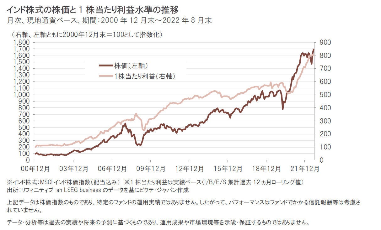世界経済の先行き不透明感が強まる中、インド株式市場は大きく下落する局面もありましたが、2022年年初来、足元まででは上昇しており、新興国の中でも相対的に堅調です。この背景の1つには引き続き相対的に高い成長が期待できるとの見方があります。また、海外投資家がリスク回避の動きを強める中でも、インド国内の個人投資家の増加・投資資金の拡大などは、インド株式市場を下支えしているとみられます。