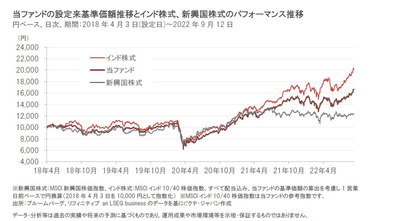 また、インド株式のアクティブ運用を行う当ファンドの基準価額についても、インド株式に比べて劣後しているものの、同期間で+12.1%の上昇となりました。