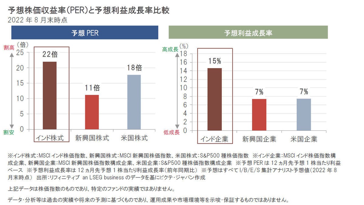 インド株式のバリュエーション(投資価値評価)を2022年8月末時点の予想株価収益率(PER)水準でみると、相対的に高水準にあります。