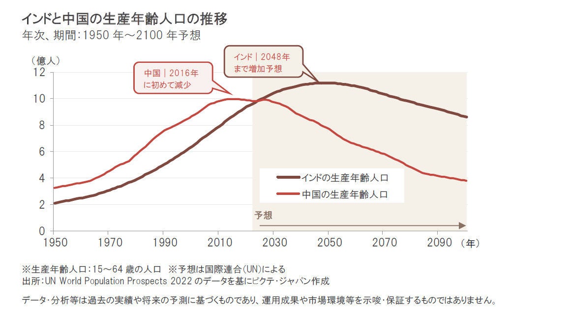 労働の担い手となる生産年齢人口の推移をみると、過去数十年にわたって高成長を遂げてきた中国は既に減少傾向に転じつつあります。一方のインドは2048年まで増加が続くと予想されています。