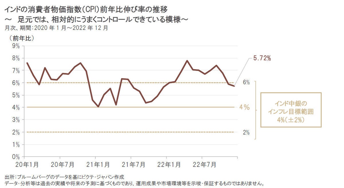 インドの2022年12月の消費者物価指数前年比伸び率は5.72%と、インド準備銀行(中央銀行、以下、インド中銀)のインフレ目標範囲内(4%±2%)へと低下しました。
