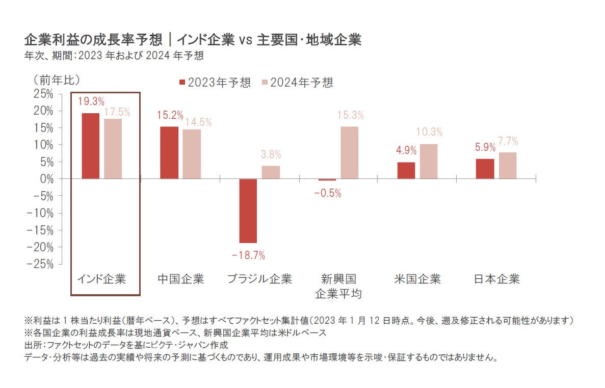 足元では、世界経済の先行き不透明感が高まっていますが、インドは引き続き相対的に高成長が予想されています。また、インド企業の利益についても、市場コンセンサス(2023年1月12日時点)では、今年(2023年)、来年(2024年)と2ケタ増益が予想されています。