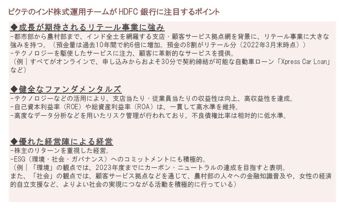 ピクテではHDFC銀行について、成長余地が大きいリテール事業に強みを持ち、健全性や収益性を重視した優れた経営が行われているとみており、今後も持続的に成長が期待できる優良企業であると評価しています。。