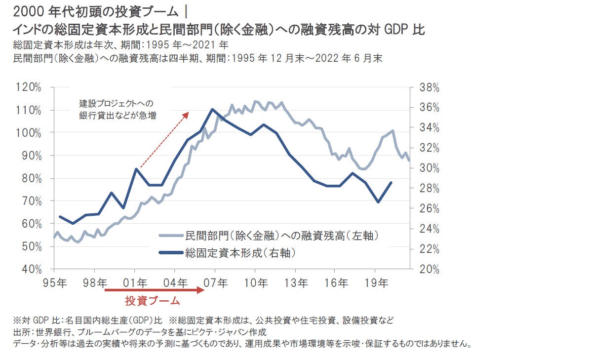新興国の成長力に注目が集まった2000年代初頭から、インドでも投資ブームが起こりました。これに伴い、銀行などによる建設プロジェクトなどへの貸出が急拡大していきました。しかし、インド特有の様々な問題(困難な土地収用、認可の遅れなど複雑な行政手続きの影響等)に加えて、その後の景気減速などが重なり、プロジェクトが中断するといった事態が多発しました。こうした状況が2010年代以降、不良債権問題を深刻化させる要因となりました。