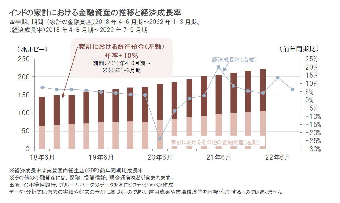 インドの家計における金融資産は、着実な拡大傾向が続いています。金融資産のうち、多くを占めているのは銀行預金です。