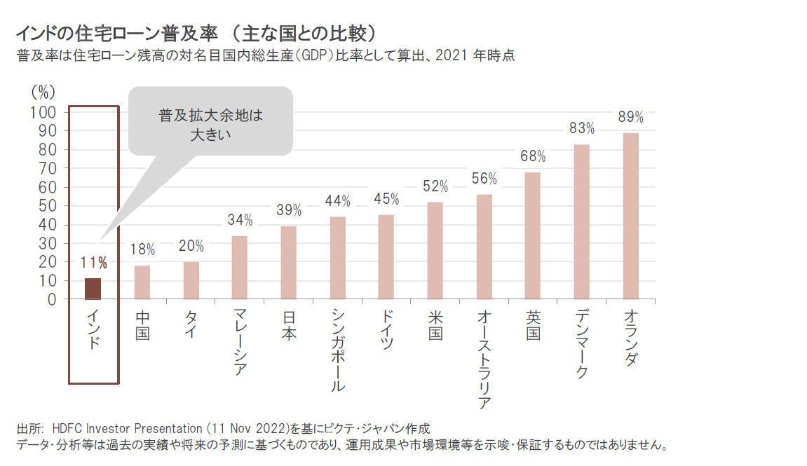 インドの個人向け融資は増加傾向にありますが、住宅ローンを例に挙げると、諸外国に比べて普及率は依然として低い水準にあります。インドには若い人々が多く、今後、自動車や住宅を購入するであろうとみられる人口層が諸外国に比べて大きいことを勘案すると、個人向け融資の普及率は高まっていくと予想されます。