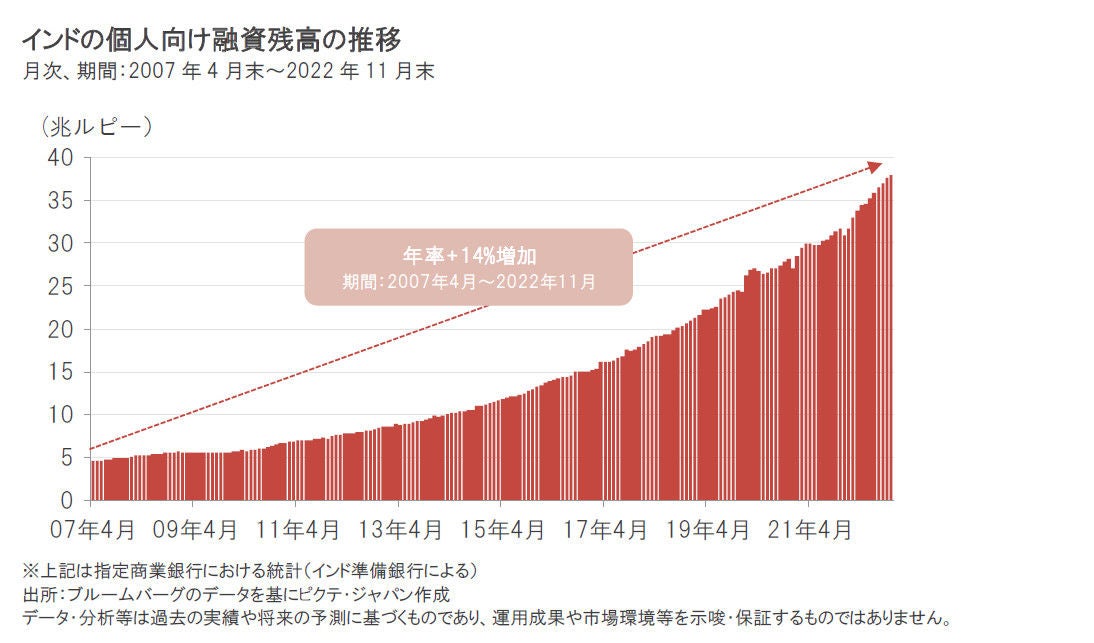 また、インドの人々は消費を拡大していく中で、身近な消費財から、自動車や住宅など、より高額なものを購入するようになります。この場合、自動車ローンや住宅ローン(銀行からの融資)を利用する機会も増えていくことは容易に想像できます。実際に、個人向け融資は年々増加しています。